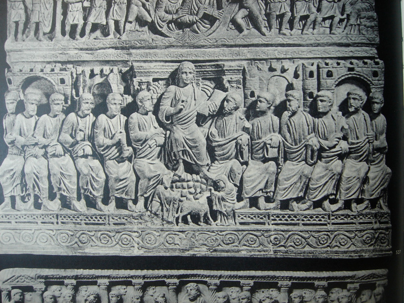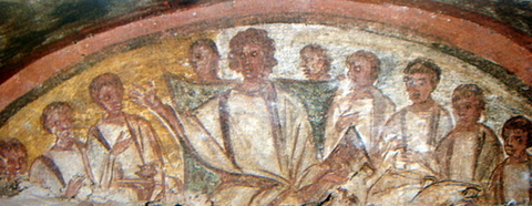 L’image du Christ enseignant est très tôt représentée dans l’iconographie paléo-chrétienne. On trouve par exemple à Rome dans les Catacombes de Domitille, qui datent du IVe s., une des premières scènes du Christ enseignant, il est vêtu à l’antique, tel le philosophe au milieu de ses disciples. L’art paléo-chrétien s’est beaucoup inspiré de l’art antique, des fresques, des miniatures, des bas-reliefs.