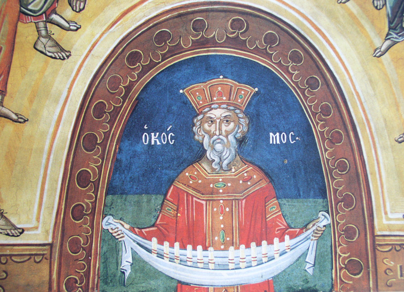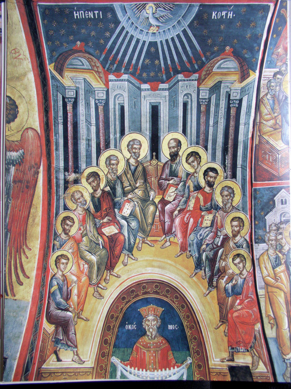 Il s’agit d’un monde vieilli, meurtri, fatigué (Byzance) mais qui tient fermement les douze rouleaux de la prédication apostolique en les offrant aux nations tourmentées en vue de leur salut » écrit le père Nicolas, in « L’accomplissement des temps et le salut des nations dans l’iconographie orthodoxe de la Pentecôte » - in: "Eschatologie et liturgie", Conférence Saint-Serge, XXXIe semaine d’Etudes Liturgiques, Paris 1984, p. 247.