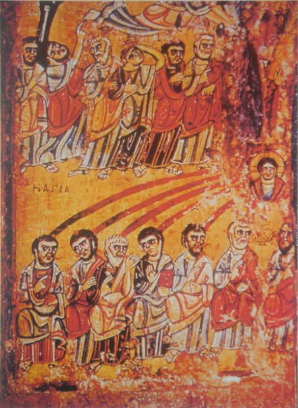13 Ces langues de feu qui tombent sur les apôtres sont l’essentiel de l’icône de la Pentecôte la plus ancienne dont on ait trace, conservée au monastère de sainte Catherine, au mont Sinaï. Nous voyons chacun des apôtres recevoir une langue de feu, le don de l’Esprit est partagé, la prédication apostolique, c’est aussi le partage de ce don. [voir fragment 1 - voir fragment 2]