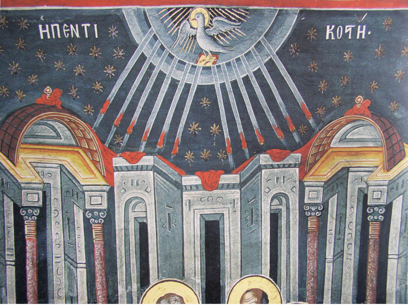 Les Actes des Apôtres nous disent que la descente de l’Esprit se fit dans un grand bruit et une confusion générale. Cependant, sur l’icône nous voyons exactement le contraire : un ordre harmonieux, une composition rigoureuse. L’attitude hiératique des Apôtres exprime calme et solennité.